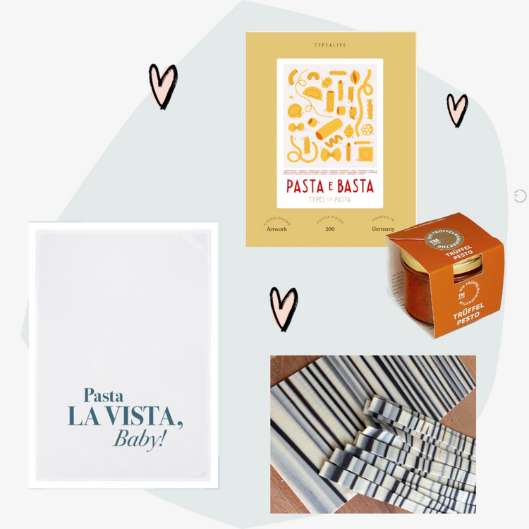 Richtig edel wird es mit den Fettucine in Zebrafarben von INO Genussatelier, Trüffel-Pesto von der Trüffelmanufaktur, dem Geschirrtuch „Pasta La Vista, Baby“ von 17;30 und dem Puzzle „Pasta e Basta“ von typealive – für Genuss über den Tellerrand hinaus.